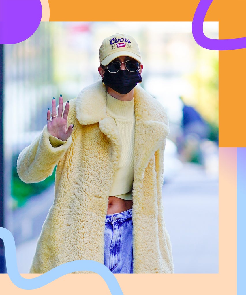 For the occasion, the model chose to balance out the luxe outerwear — the coat retails for around $9,450 — with a yellow Coors baseball cap, a matching yellow cropped sweater, Air Force 1s, and a pair of her signature baggy, low-rise jeans. She topped off the look with gold-rimmed sunglasses, chunky hoop earrings, and a black, disposable face mask.