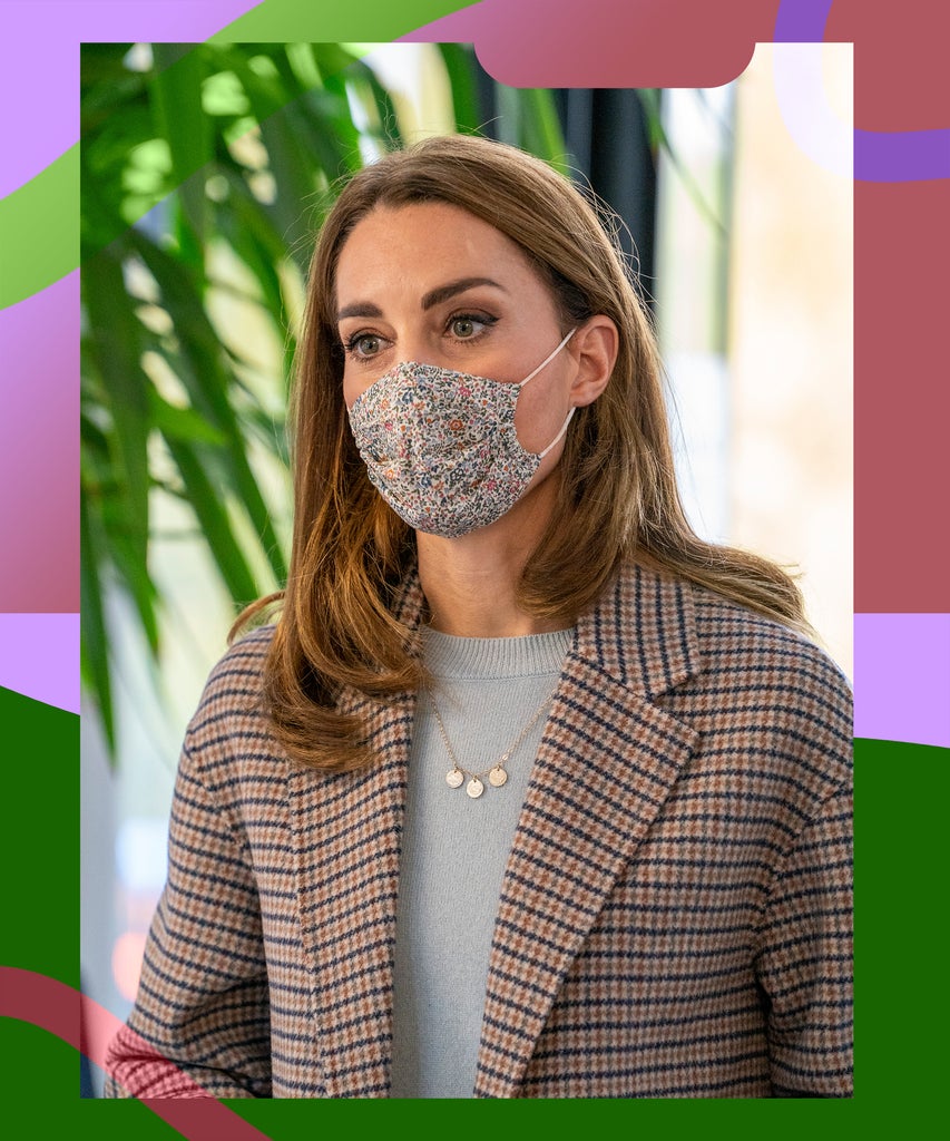 On Tuesday, during a trip to the University of Derby in England, the Duchess of Cambridge not only re-wore her favorite floral face mask, but she paired it with another print in the form of a plaid coat. There to speak with students about how the pandemic has affected their university experience, as well as their mental health, Middleton went full prep, pairing her fall-appropriate checkered outerwear with a sky blue cashmere sweater, both courtesy of Zara’s luxury sister brand Massimo Dutti, high-waisted black trousers, and a pair of chunky heel pumps. She even carried around a University of Derby tote bag in order to, you know, fit right in.